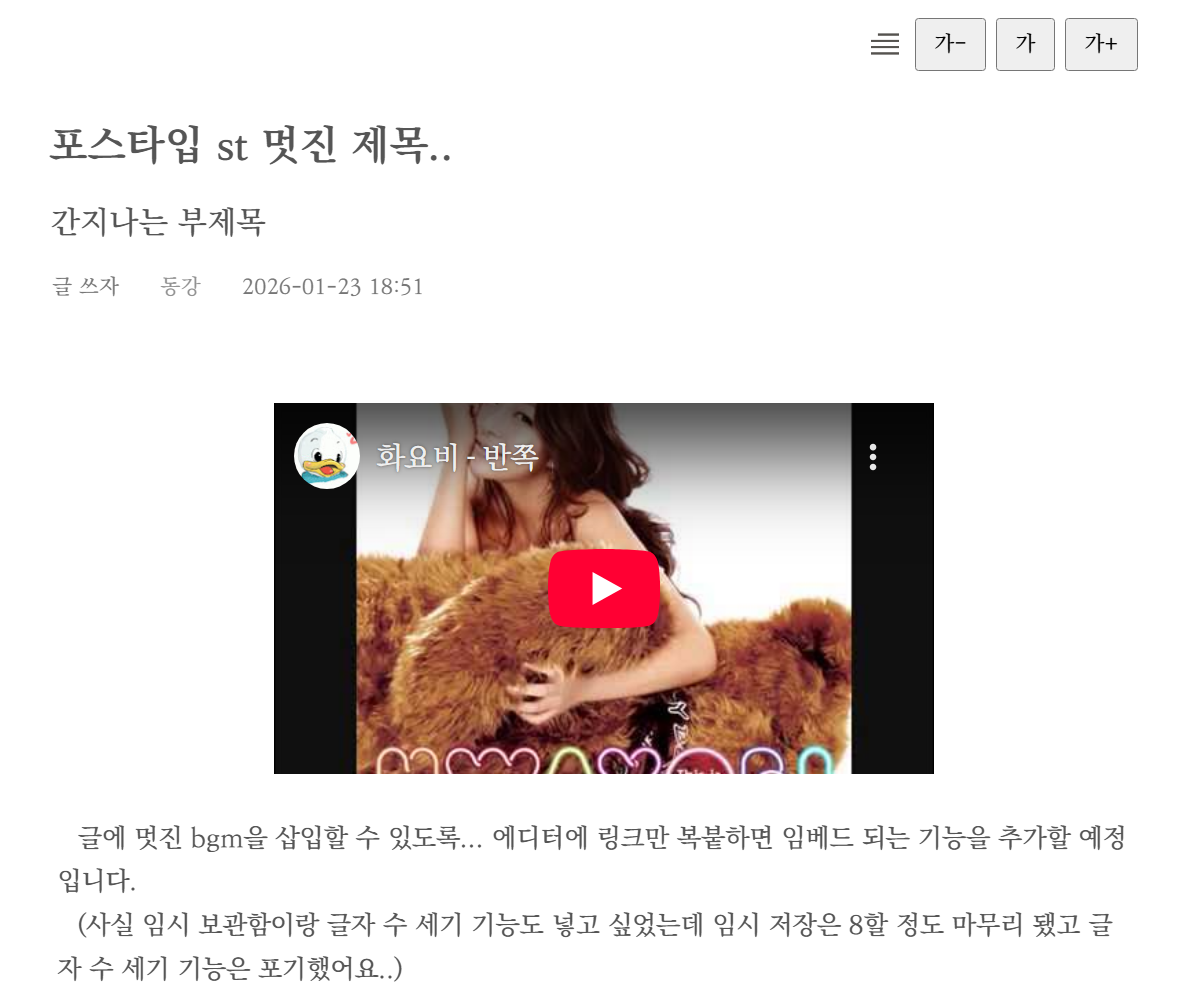 6. 에디터에서 유튜브 링크를 입력하시면 보기 화면에서는 자동으로 유튜브 임베드가 적용됩니다. 링크 글씨의 정렬에 따라 임베드도 똑같이 정렬이 맞춰져요! (좌측우측중앙양쪽)