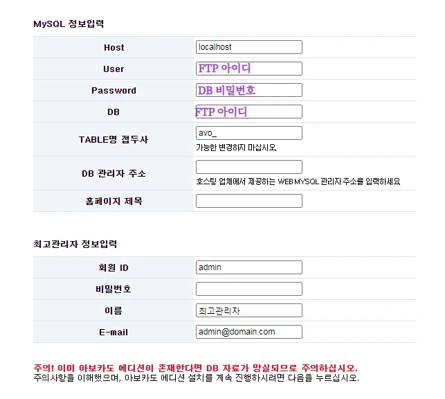 그 다음은 호스팅 신청 시 설정한 FTP 아이디, DB 비밀번호가 필요한 순간입니다.
