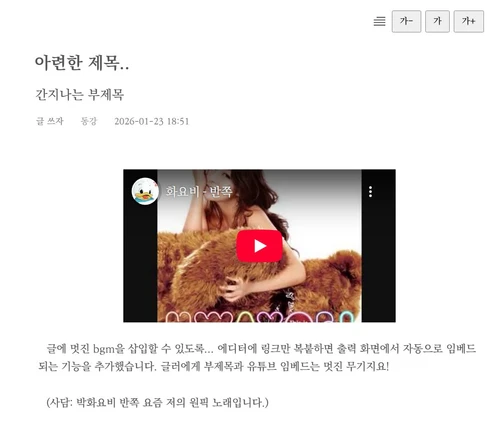 들여쓰기 온오프, 글씨 크기 조절 가능한 뷰어와 부제목 기능을 제공합니다. 유튜브 url을 입력하면 뷰어에서 자동 임베딩 출력됩니다.
