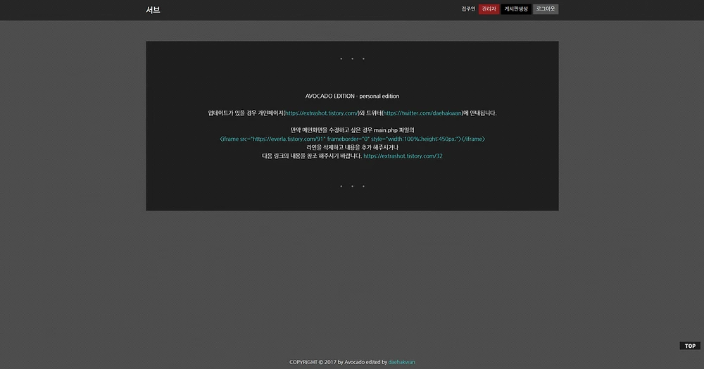 화면 상에서 없애고 싶은 요소들, 이를 테면 버튼이나 하단의 카피라이트 문구 등...이 있다면 파일질라를 열어 해당 코드를 지우면 됩니다. 예를 들어 카피라이트 문구는 public_html/tail.php 파일을 열어서 COPYRIGHT © 2017 by Avocado edited by daehakwan 이 부분을 지워주시면 됩니다. 파일 편집은 기본 메모장 프로그램으로 가능해요!
