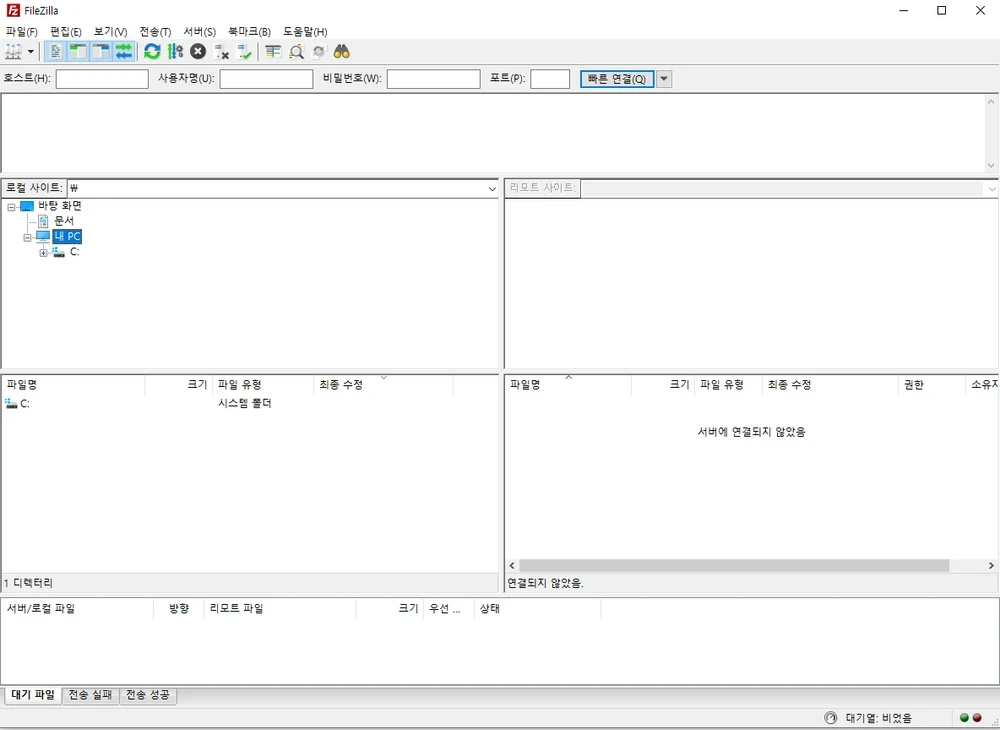 상단의 호스트, 사용자명, 비밀번호, 포트 란에 기입해서 로그인합니다.