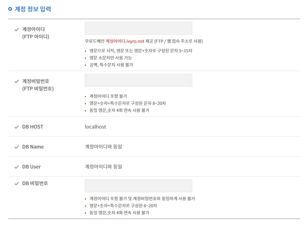 - FTP 아이디: 갠홈 도메인이 됩니다. 여기서 아이디를 whyrano(와이라노)라고 설정했다 치면 갠홈 주소가 whyrano.ivyro.net이 됩니다.