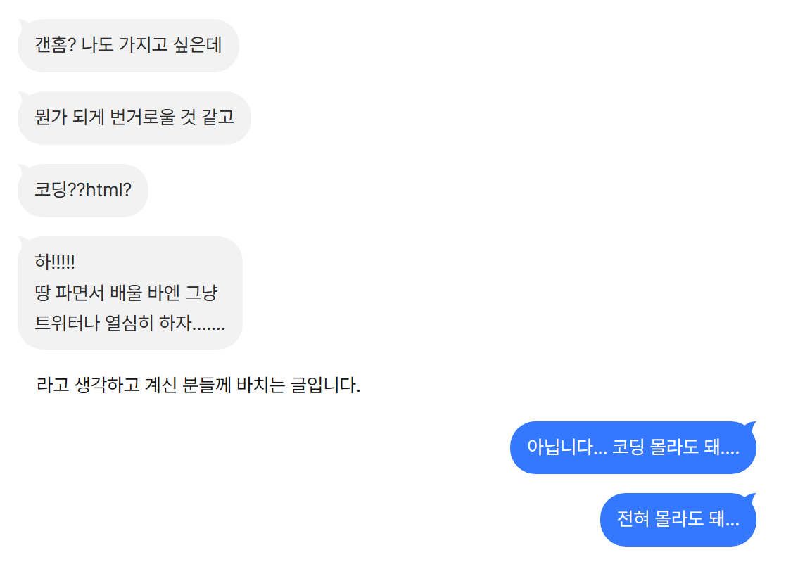 결론부터 말하자면, 갠홈 처음 시작은 전혀 어렵지 않습니다...👽 코딩 까막눈이셔도 괜찮습니다. 멋진 디자인의 스킨들은 배포해주시는 걸 다운 받기만 하면 되니까요. 시작이 반이다 라는 말이 있듯이, 갠홈은 진입장벽이 있(어 보이)지만 자신이 개발자가 되지 않는 이상 어렵지 않습니다,,!!! 진짜.... 정말로.......